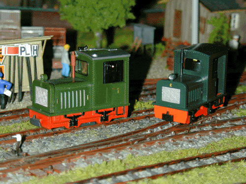 Egger-Bahn #1001, eine Gmeinder Diesel. Beide laufen super. Die rechte ist aus der ersten Produktion - sie hat die kurze Haube.