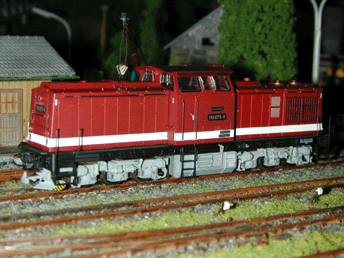 Brawa Modell der HSB DR 199 879. Eine reguläre 110 wurde einfach auf Schmalspur-Trucks gestellt.