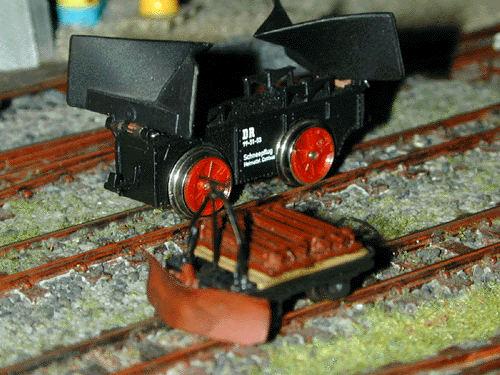 Schneepflüge - vorne ein typischer Feldbahn-Schneepflug, hinten ein Schneepflug der Spreewaldbahn aus einem Lokomotivchassis.